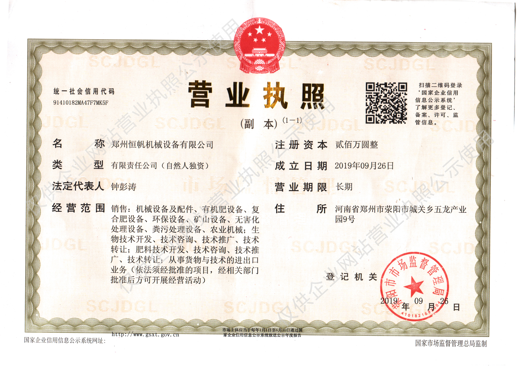版權(quán)所有:鄭州恒帆機械設(shè)備有限公司  地址:河南省鄭州市滎陽市城關(guān)鄉(xiāng)五龍產(chǎn)業(yè)園  豫ICP備19044896號-1  網(wǎng)站地圖有機肥生產(chǎn)線配置方案豫公網(wǎng)安備 41018202000710號  營業(yè)執(zhí)照公示